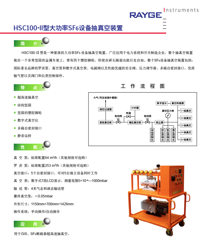 HSC100II型是一種緊湊的大功率SF6設備抽真空裝置,廣泛應用于電力系統(tǒng)和開關制造企業(yè),整個抽真空裝置裝在一個非常堅固的金屬車架上,帶有四個塑膠腳輪,即使在碎石路面也能行走自如。整個SF6設備抽真空裝置包括:國際著名品牌的羅茨泵、真空泵和數(shù)字式真空表、電磁閥以及性能優(yōu)越的安全閥、壓力調(diào)節(jié)器、多路自密封接口,優(yōu)質輸氣管以及閥門和儀表控制部件。