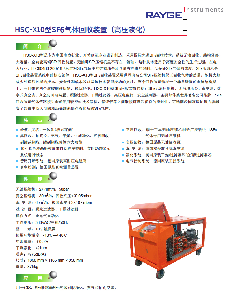 HSC-X10型是專為中國電力行業(yè)、開關制造企業(yè)設計制造,采用國際先進SF6回收技術,系統(tǒng)無油回收、結構緊湊、大容量、全功能高端SF6回收裝置。
