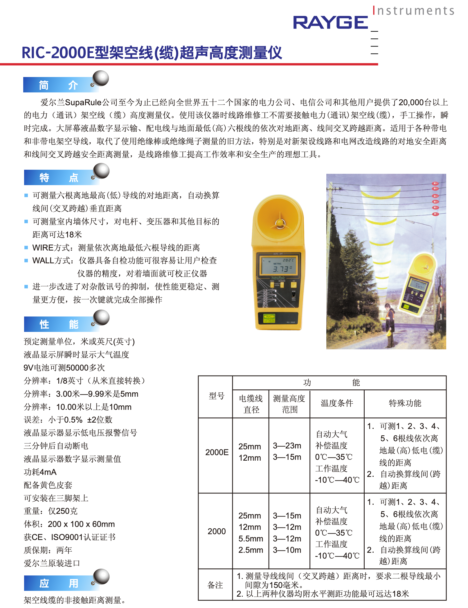 愛爾蘭SupaRule公司至今為止已經(jīng)向全世界五十二個(gè)國(guó)家的電力公司、電信公司和其他用戶提供了30,000臺(tái)以上的電力(通訊)架空線(纜)高度測(cè)量?jī)x。使用該儀器時(shí)線路維修工不需要接觸電力(通訊)架空線(纜),手工操作,瞬時(shí)完成。適用于各種帶電和非帶電架空導(dǎo)線,取代了使用絕緣棒或絕緣繩子測(cè)量的舊方法,特別是對(duì)新架設(shè)線路和電網(wǎng)改造線路的對(duì)地安全距離和線間交叉跨越安全距離測(cè)量,是線路維修工提高工作效率和安全生產(chǎn)的理想工具。